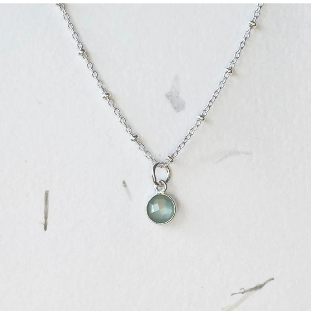 Ce collier en calcédoine est si délicat et léger. Pierre de naissance mars. Une petite pierre facettée est sertie en argent sterling ainsi qu'une chaine satellite.