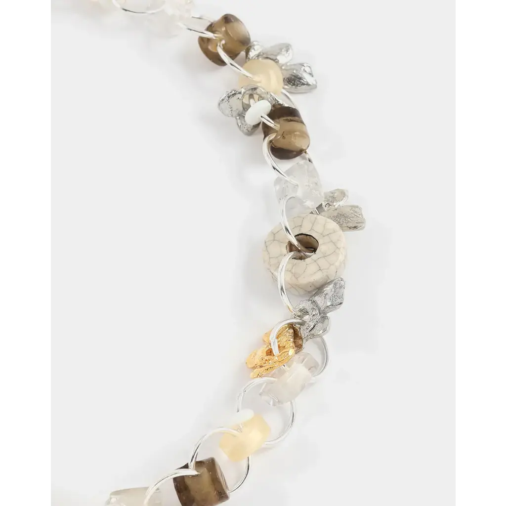 Conçu pour celles qui osent un style affirmé, le collier court Polaris se distingue par sa chaîne sculpturale et robuste composée d'anneaux surdimensionnés. Ses maillons généreux sont mis en valeur par le contraste des matières : étain naturel, métal plaqué or 22 carats, résine brillante, verre éclatant et céramique texturée. Orné de charms floraux Félice, notre motif signature de la saison, ce bijou vibrant irradie d'énergie organique. Un accessoire saisissant où force, éclat et mouvement se conjuguent. Fabriqué à la main au Québec depuis 1995