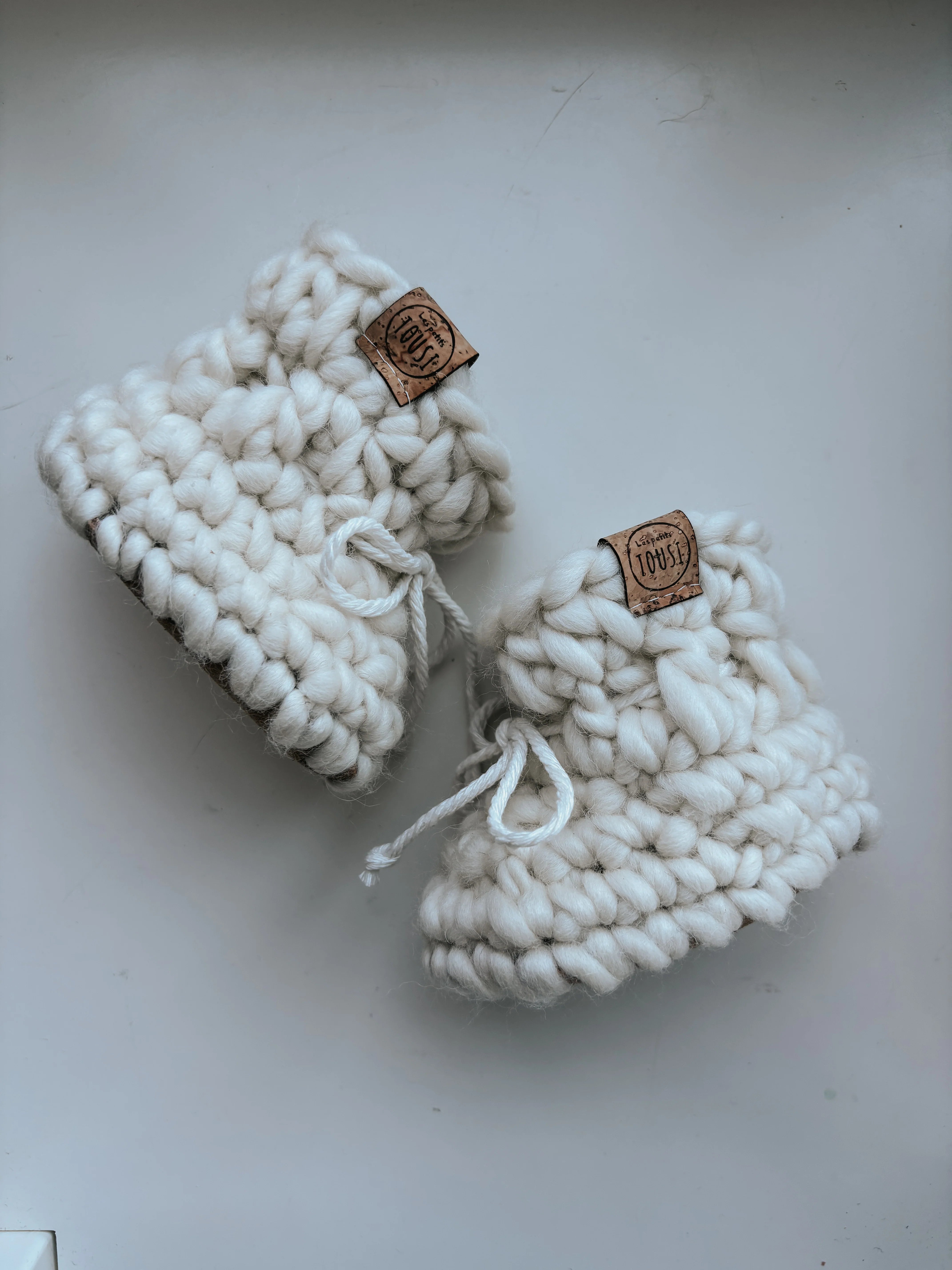 Magnifiques petites pantoufles crochetées à la main, fabriquées avec une douce laine de mouton et alpaga péruvienne 100% naturelle, renouvelable et biodégradable. Leurs semelles, quant à elles, sont fabriquées à partir de retailles de cuir véritable doublé en peau de mouton. Non seulement ces petites pantoufles sont adorables, elles sont également antidérapantes pour les petits pieds qui apprennent à marcher en plus de tenir très bien en place grâce à un petit cordon de coton à la cheville.