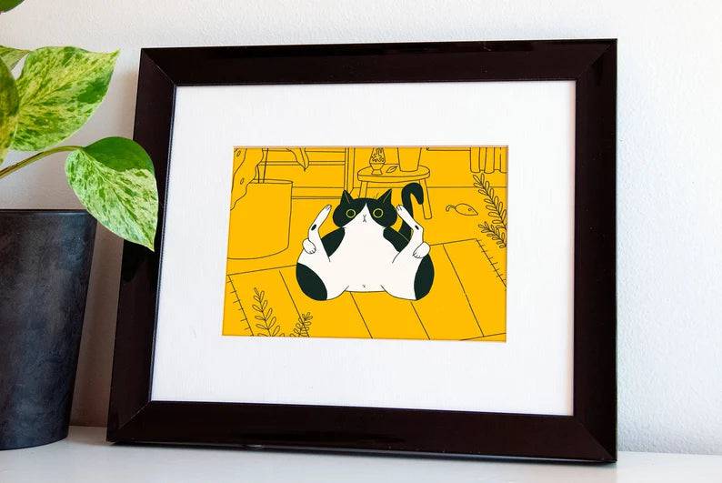 Ajoutez une touche d'humour et de légèreté à votre espace avec cette affiche mettant en scène un chat dans une position de yoga amusante et originale. Avec son design ludique, elle célèbre le côté drôle des chats et leur esprit espiègle. Parfaite pour les amateurs de chats qui apprécient leur côté humoristique, cette affiche apporte une note joyeuse et unique à tout salon, bureau ou chambre. Imprimée sur un carton épais, elle se distingue par son style amusant et ses détails.