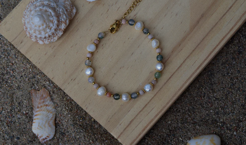 Conçu pour être porté seul ou superposé, le bracelet perlé de dunes de sable présente la belle aventurine rose, l'agate verte glace et les poires d'eau douce.