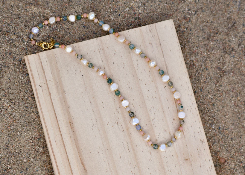 Conçu pour être porté seul ou superposé, le collier perlé Sandy Dunes combine l'aventurine rose, l'agate vert glace avec l'élégance des perles d'eau douce.