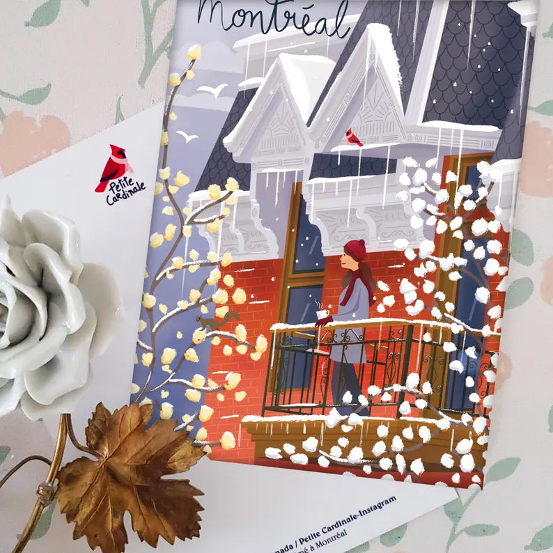 Illustrations hivernales de maisons et paysages typiques de Montréal et du Québec.