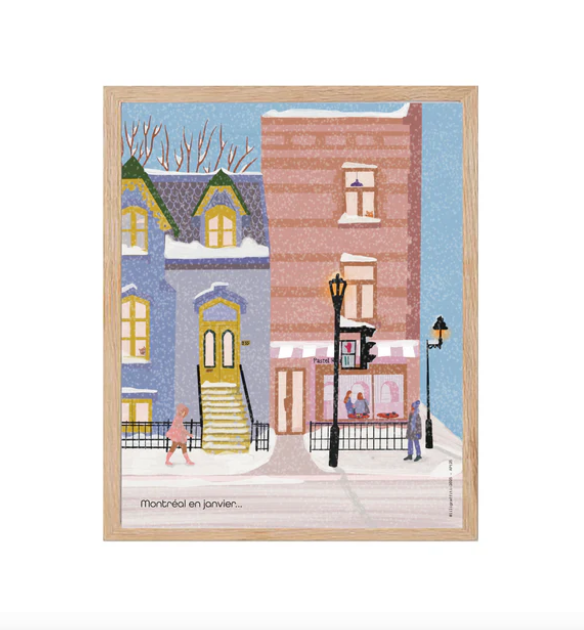 Apportez une touche de charme hivernal à votre intérieur avec cette affiche murale décorative représentant une scène enneigée de Montréal en plein mois de janvier. Devant un café chaleureux et des maisons typiques du Plateau, les passants emmitouflés traversent une ville tranquille, paisible sous la neige. Une illustration poétique et sensible signée Marie-Laure Plano.
