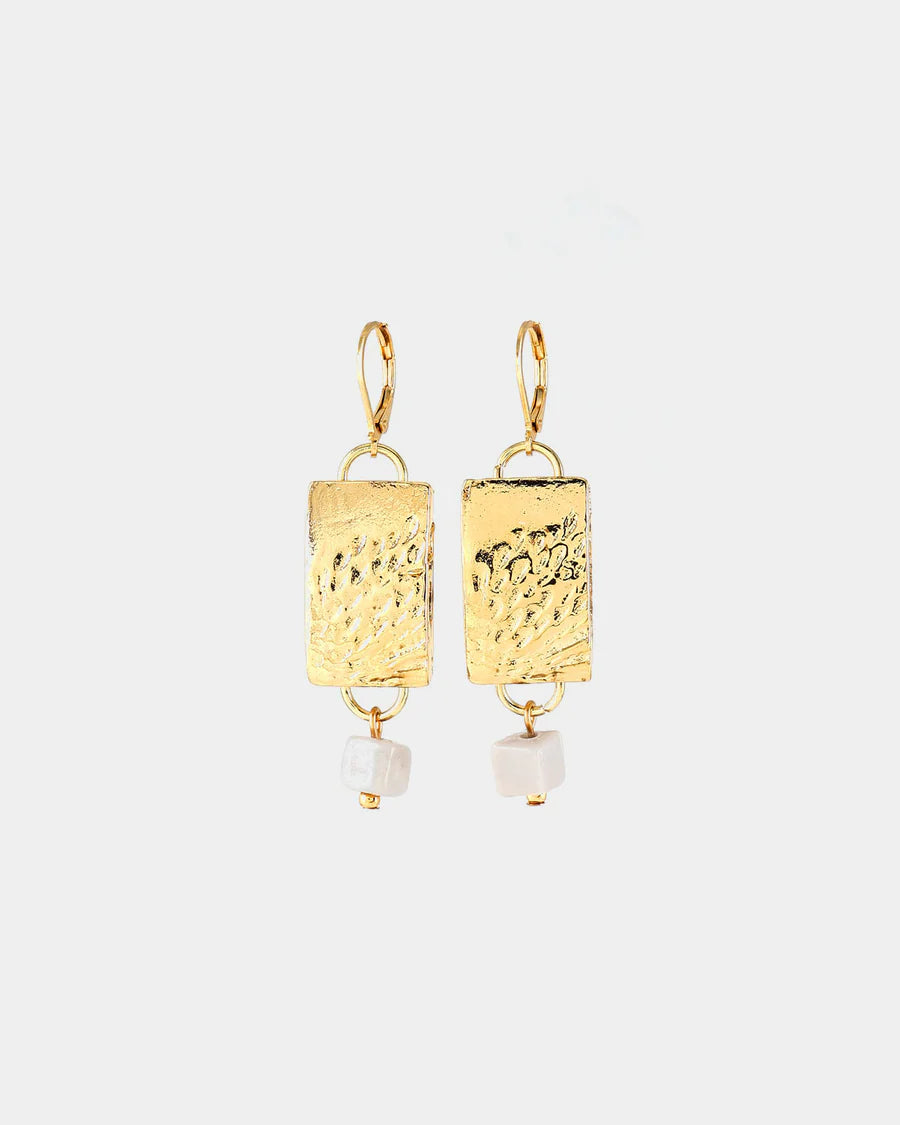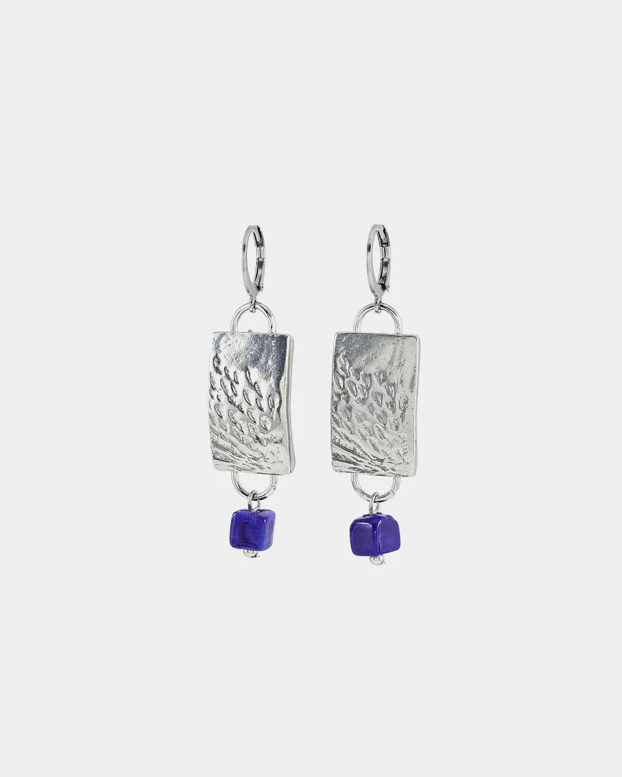 Les boucles d’oreilles Vulpecula s’imposent par leur allure sculpturale et leur équilibre affirmé. Une pièce rectangulaire en étain naturel ou plaqué or 22 carats, travaillée comme un fragment d’artefact, sert de base à un prisme de verre coloré ou à une perle d’eau douce suspendue. Une création audacieuse, où chaque élément compose une tension élégante entre matière brute et éclat maîtrisé.