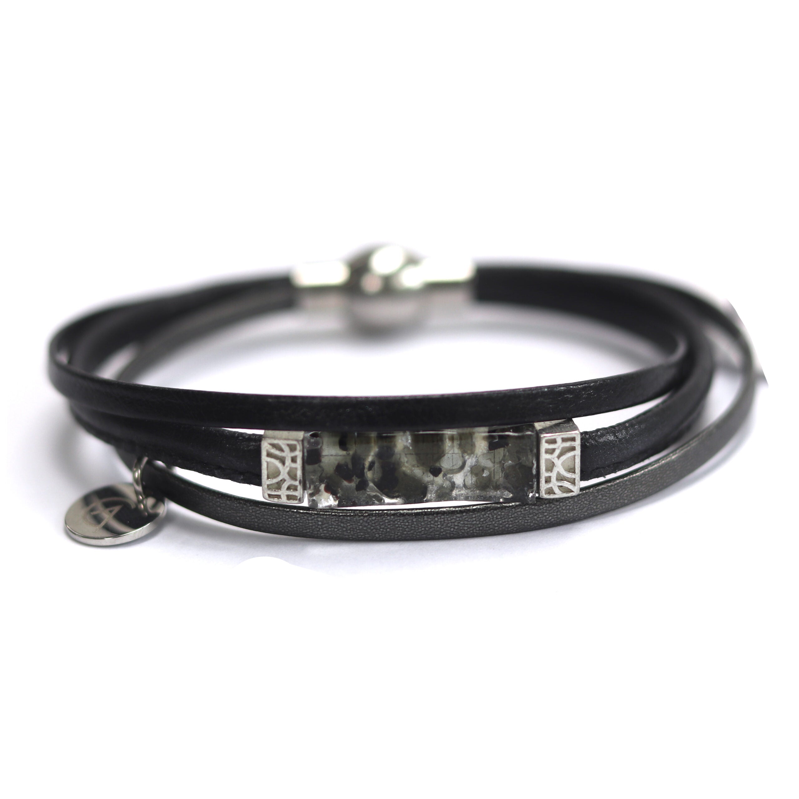 Bracelet fabriqué au Québec à partir de trois lanières de cuir et agrémenté d’une pièce d’étain et de verre.