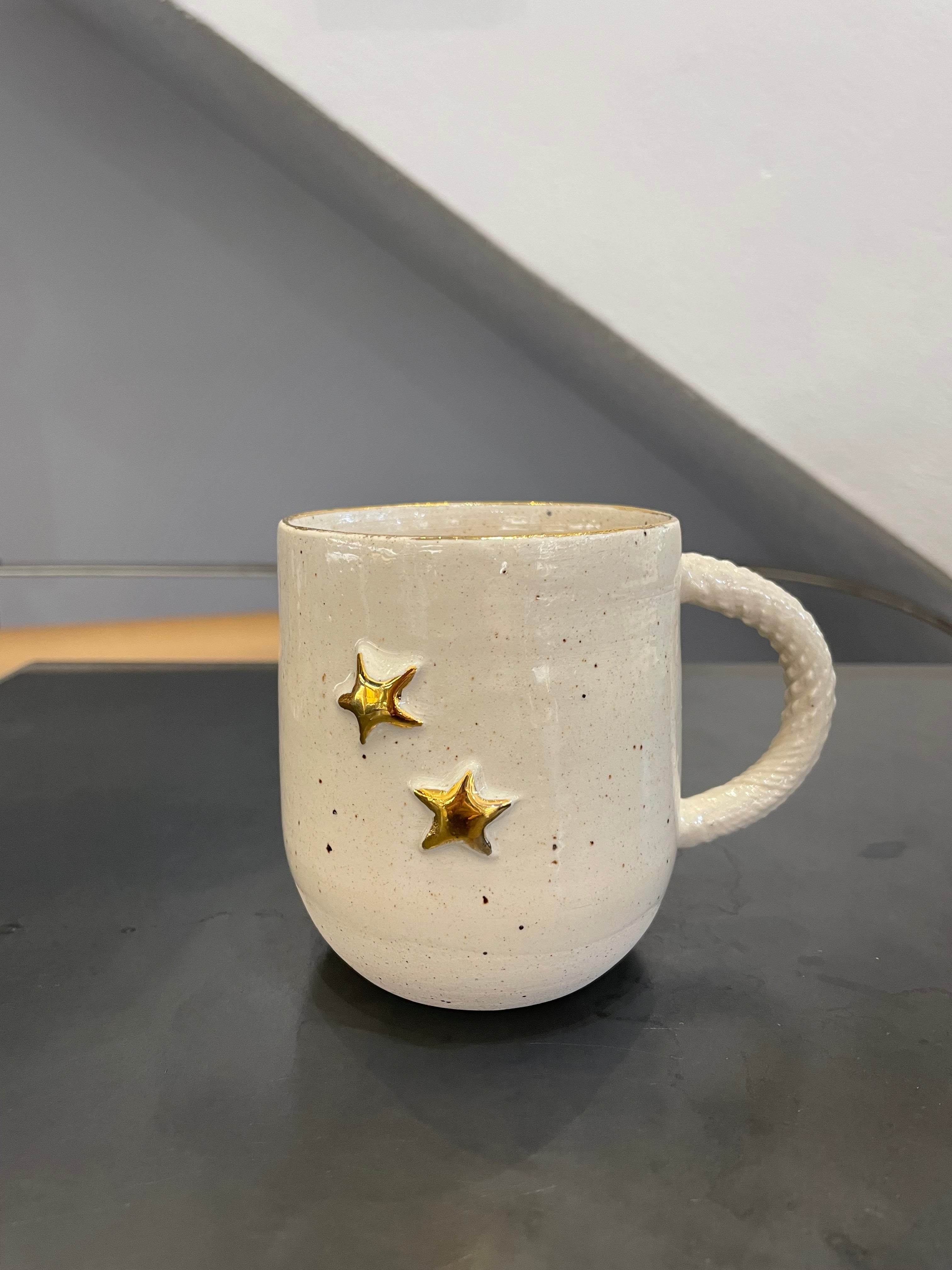 Tournée dans une terre pyritée qui lui donne les petits points foncés, elle est décorée de deux étoiles en or. La lèvre est également soulignée par un liseré en or.