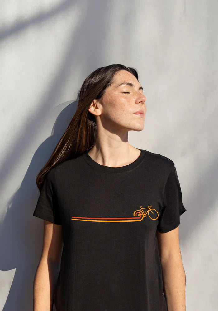 Voici le t-shirt à manches courtes en coton biologique. Sa coupe semi-ajusté saura vous séduire. Vous aimerez le confort et la douceur de ce t-shirt noir Disco Bike, conçu et fabriqué au Québec. Cet imprimé graphique orange et jaune est un clin d’œil aux amateurs de vélo. N'hésitez pas à l'offrir en cadeau ! Achetez des vêtements durables aide à réduire votre empreinte carbone.